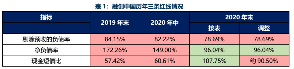 自19至20年之間,融創的三道紅線指標均有改善,除了依賴于融創服務上市外,加速去化并減少拿地亦是公司降杠桿的主力。順帶一提,從圖2也可看出,剔除資產負債率屬于三個指標最不易調整的指標,該指標體現了公司整體業務布局的激進程度(杠桿程度)。只要公司仍然利用杠桿進行擴張拿地,自黃檔晉升為綠檔的可能性仍較低,并不是單單利用加快去化得以調節的。
