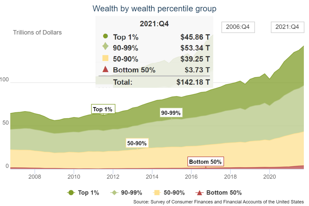 根據(jù)美聯(lián)儲(chǔ)發(fā)布的美國(guó)2021年第四季度家庭財(cái)富分布情況: