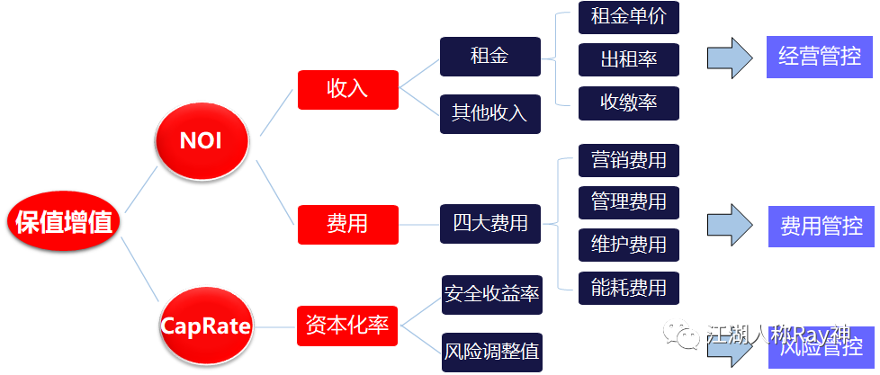 當然,對許多地方性國企來說也許租金收益不是他們的目標;但需要思考的是,他們是否承載著實現(xiàn)國有資產(chǎn)保值增值、實現(xiàn)盤活低效資產(chǎn)的職責。而這些方面,同樣也是離不開做好項目運營,離不開做好現(xiàn)金流管理的。因為,盤活低效資產(chǎn)必須通過運營手段來讓資產(chǎn)得到有效利用,而保值增值則是需要讓資產(chǎn)產(chǎn)生得到市場認可的價值——遵循市場規(guī)律,就需要通過運營收益來撬動資產(chǎn)價值,即:資產(chǎn)價值(V)=凈營業(yè)收入(NOI)/資本化率(CapRate)。