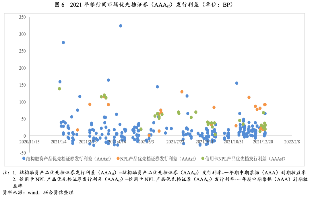 2021年,NPL優先檔證券(AAAsf)發行利率高于一年期中期票據(AAA)發行利率6.13-146.45BP。其中,基礎資產為信用卡、個人消費型NPL產品,優先檔證券(AAAsf)發行利差較小,為6.13-81.37BP,平均利差34.35BP;基礎資產為企業貸款的發行利差最大,為119.67-130.68BP,平均利差124.26BP。