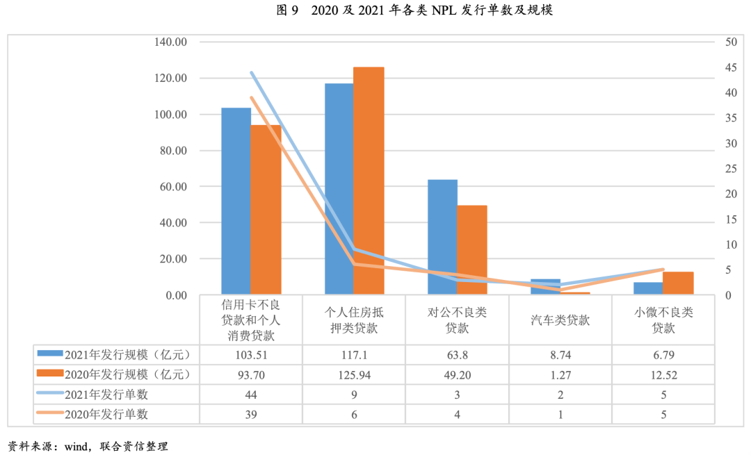 2021年發行的NPL產品中有44單以信用卡不良貸款和個人消費貸款為基礎資產,證券發行規模合計為103.51億元,占NPL總發行規模的34.51%,涉及不良貸款本息費達1185.68億元。