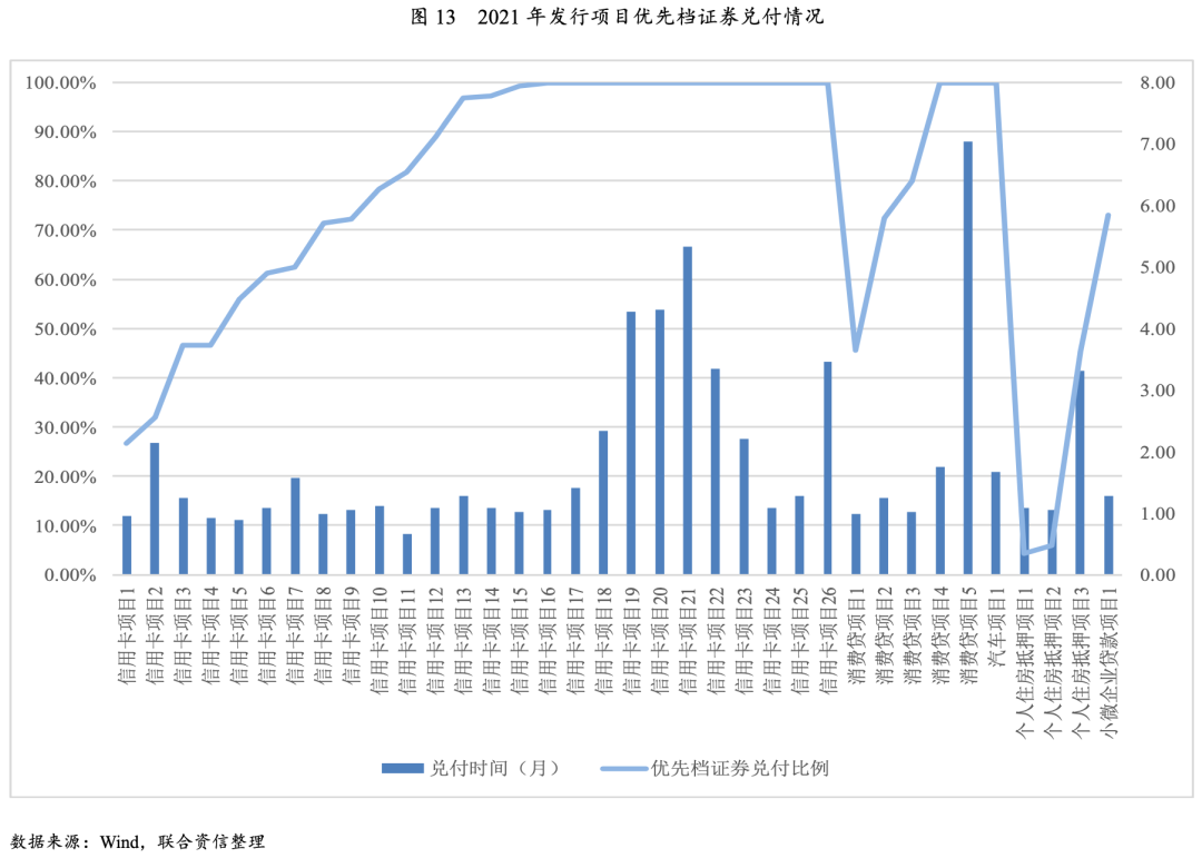 以2021年新發行不良ABS項目為例,截至2021年底,本年度新發行的不良ABS項目中,除27單尚未達到首次支付日的項目以外,有14單項目優先檔證券已經兌付完畢,其中11單為信用卡不良貸款ABS,2單為消費貸不良貸款ABS,1單為汽車不良貸款ABS。優先檔證券未完全兌付項目中,有14單項目的優先檔證券已兌付50%以上,其中11單為信用卡不良貸款ABS,2單為消費貸不良貸款ABS,1單為小微企業不良貸款ABS;有6單項目的優先檔證券兌付20%-50%,其中4單為信用卡不良貸款ABS,1單為消費貸不良貸款ABS,1單為個人住房抵押不良貸款ABS;有2單項目優先檔證券兌付低于10%,均為個人住房抵押不良貸款ABS。從優先檔證券的兌付情況看,信用卡、消費貸這類個人信用類不良貸款ABS的兌付速度快于有抵押的個人住房不良貸款ABS和小微企業不良貸款ABS。