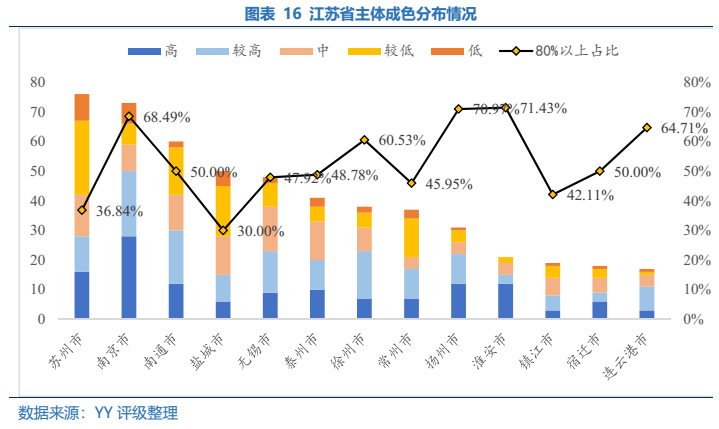 分地市觀察,地級市之間的城投成色平均水平差異較大,下圖首先展示的是本次城投成色測算平臺數量超過20個的地級市平臺情況,可以觀察到以江蘇省的蘇州、鹽城,山東省的青島為代表的區域主體城投成色平均水平較低,成色中等以上的平臺數量占比不到40%。