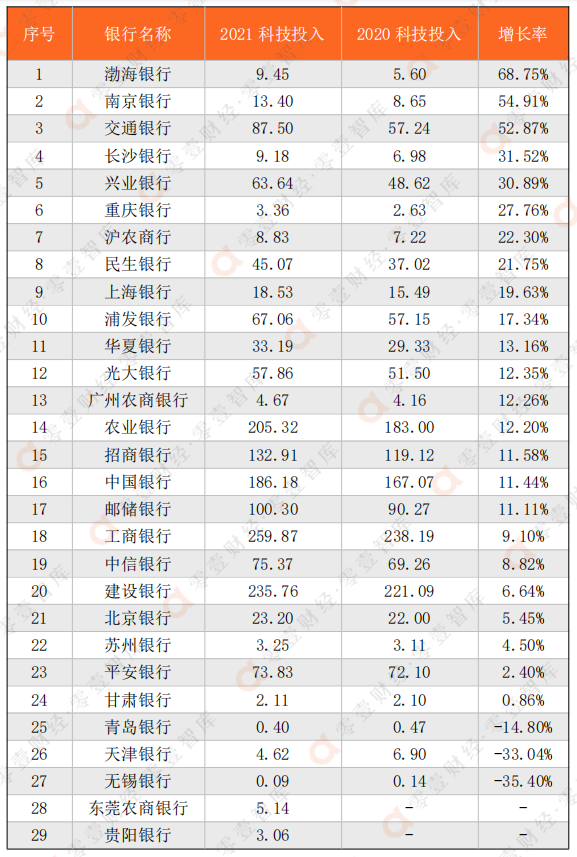 各銀行近年來積極加大科技投入,主要應(yīng)用在加快銀行的數(shù)字化、智能化轉(zhuǎn)型,提升專業(yè)化水平和服務(wù)效率、強(qiáng)化科技研發(fā)能力、完善風(fēng)險(xiǎn)管理水平等方面,29家銀行的科技投入數(shù)據(jù)和排名情況如下: