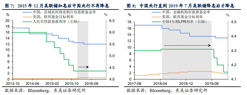 簡單說,2015年12月美聯(lián)儲加息后,我國央行不再降息;然后,我國央行直到2019年7月美聯(lián)儲降息后,才跟著降息。