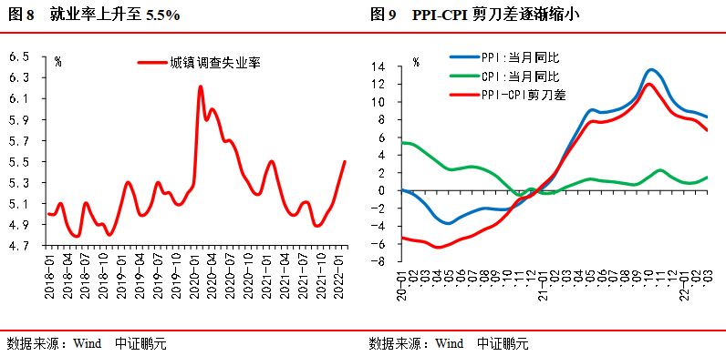 二是就業和物價有一定壓力。針對經濟面臨的新挑戰,近期國常會指出穩增長的目標是保持經濟運行在合理區間,保持經濟運行在合理區間主要是穩就業、穩物價。今年政府工作報告目標是城鎮調查失業率全年控制在5.5%以內,CPI漲幅3%左右。目前,2月城鎮失業率已至5.5%,自去年10月開始連續5個月上升,當前就業壓力較大。3月PPI環比上漲1.1%,比上月擴大0.6個百分點,地緣政治等因素推動國際大宗商品價格持續上行,帶動國內石油、有色金屬等相關行業價格繼續上漲。PPI同比上漲8.3%,受去年高基數影響繼續回落0.5個百分點。3月CPI同比上漲1.5%,漲幅比上月擴大0.6個百分點,環比持平。PPI-CPI剪刀差縮小,上游價格高企已經加快傳導至消費端,輸入性通脹壓力逐步顯現。過度的貨幣寬松可能會加劇通脹壓力。