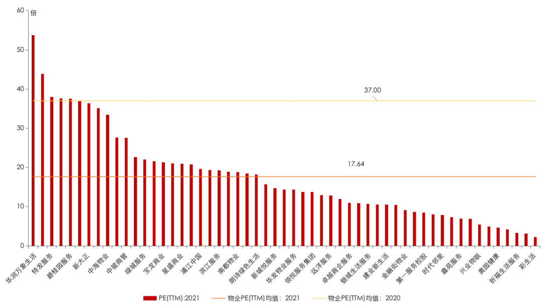下半年,資本市場遇冷,據克而瑞物管統計,至2021年末物業板塊PE均值僅為17.64倍,相較2020年末(37.00倍)降幅達52.31%。其中,市盈率最高的是華潤萬象生活,為53.72倍,較去年底下滑64.36%;市盈率最低的彩生活,為2.26倍,較去年底下滑74.66%。