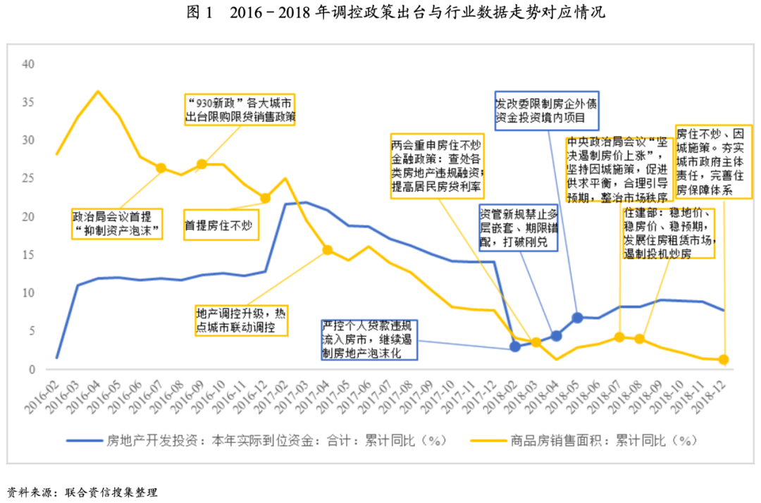 自2016年下半年開始,房地產(chǎn)行業(yè)銷售數(shù)據(jù)與需求端的調(diào)控政策緊密相關(guān),隨著調(diào)控的頻繁出臺銷售數(shù)據(jù)呈明顯下滑且自2018年開始持續(xù)地位徘徊;房地產(chǎn)開發(fā)投資本年實際到位資金與融資端/個人貸款端政策關(guān)聯(lián)度高,2018年初開始呈現(xiàn)斷崖式下滑,具體政策時點與行業(yè)數(shù)據(jù)走勢對應(yīng)情況如圖1所示,第一波行業(yè)加壓正式來臨。
