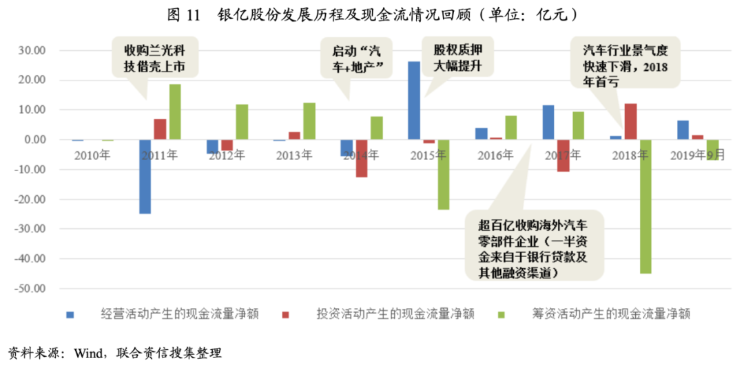 我們將銀億股份戰(zhàn)略轉(zhuǎn)型的時間節(jié)點和現(xiàn)金流情況進行對比,回顧其發(fā)展歷程我們可以發(fā)現(xiàn):公司自2014年開始啟動“汽車+地產(chǎn)”的多元化策略,2015年開始進行大量股權(quán)質(zhì)押以應(yīng)對2016年開始的大額海外汽車零部件企業(yè)收并購舉動;但公司錯過了地產(chǎn)的快速發(fā)展期,并在大額投入后迎來了汽車行業(yè)的快速下滑,并于2018年出現(xiàn)首虧,當(dāng)年融資能力快速下滑,爆發(fā)債務(wù)違約危機,具體情況如下圖所示。