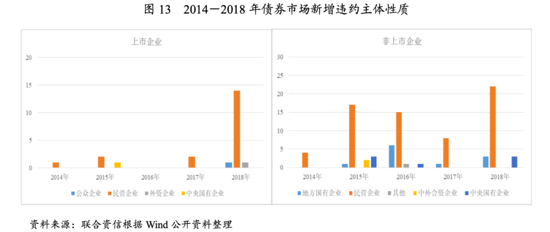 2014-2018年,非上市違約主體共87家,以民營企業(yè)為主,地方國有企業(yè)和中央國有企業(yè)也存在違約現(xiàn)象;上市主體的違約數(shù)量遠低于非上市主體,其中2018年上市主體違約數(shù)量16家,遠超以前年度,主要系2018年A股市場大幅下跌,且部分上市公司股票質(zhì)押比例過高,面臨爆倉風(fēng)險,影響再融資能力所致。