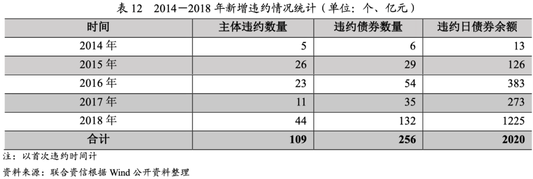 自2014年1月1日至2018年12月31日,交易所和銀行間市場共計109個主體違約,涉及256只債券,違約主體數(shù)量和違約日債券余額整體呈波動增長態(tài)勢,其中2017年由于產(chǎn)能過剩、行業(yè)盈利和融資環(huán)境好轉(zhuǎn),新增違約情況有所下降,2018年由于外部信用環(huán)境收縮,債券市場違約數(shù)量和涉及的債券規(guī)模遠超往年,且單個違約發(fā)行人涉及的債券規(guī)模高。