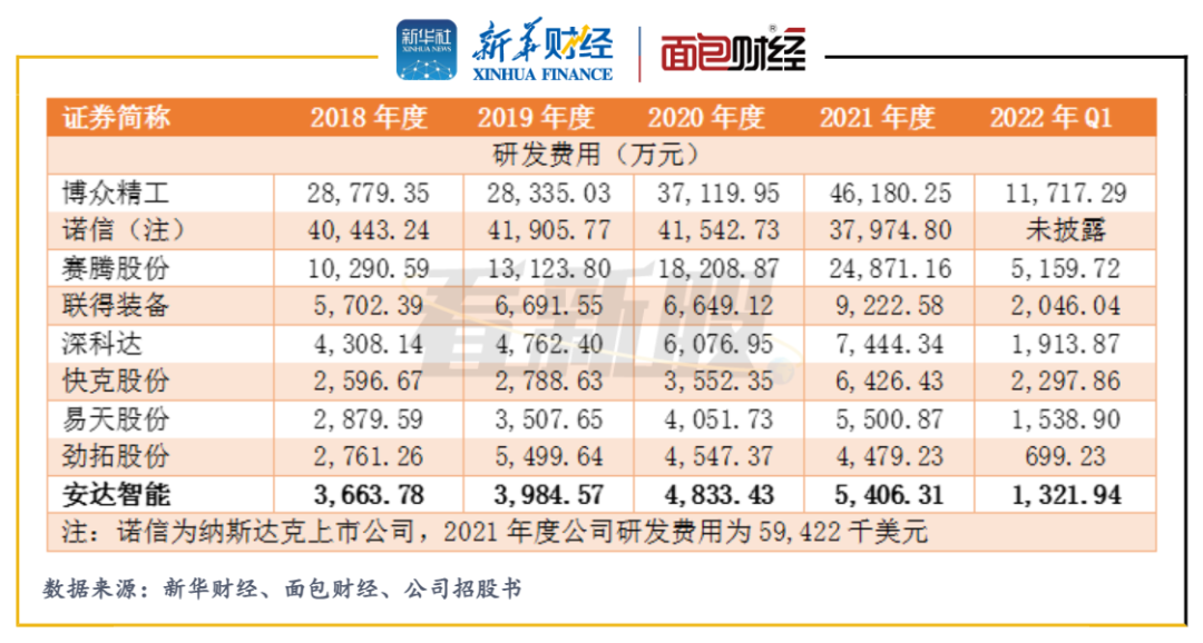 身為科創(chuàng)板新上市的智能制造裝備業(yè)公司,安達智能當前的研發(fā)投入和研發(fā)能力或難具優(yōu)勢。