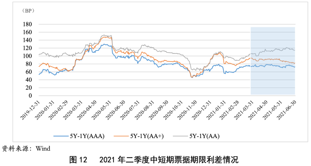 期限利差方面,本季度中短期票據期限利差整體較為平穩。本季度,隨著市場情緒好轉,AAA級及AA+級期限利差整體小幅收窄,但AA級期限利差進一步走闊。
