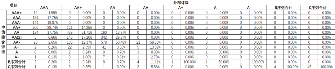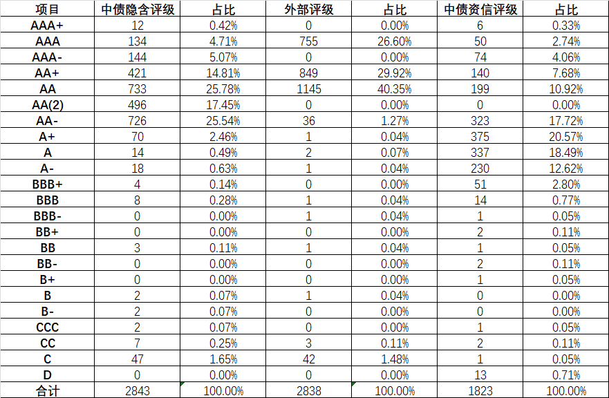 外部評級多集中于AAA、AA+及AA,然而,同樣的AAA,在中債隱含評級中可以區分為AAA+(1.59%)、AAA(17.75%)、AAA-(19.07%)、AA+(39.74%)以及AA(17.75%)等。