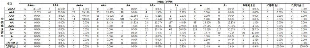中債隱含評級主要評級區間在【AA-,AAA】6檔,集中在AA-、AA(2)、AA;