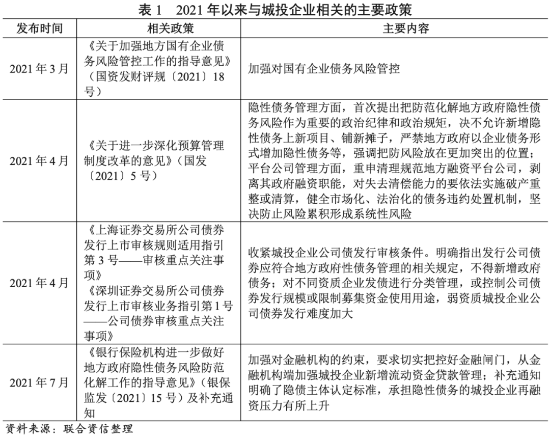 2021年以來,國發(fā)〔2021〕5號文、滬深交易所公司債發(fā)行上市審核指引、銀保監(jiān)發(fā)〔2021〕15號文及補(bǔ)充通知等政策相繼出臺,對地方政府隱性債務(wù)保持高壓監(jiān)管態(tài)勢,城投企業(yè)融資政策整體收緊。