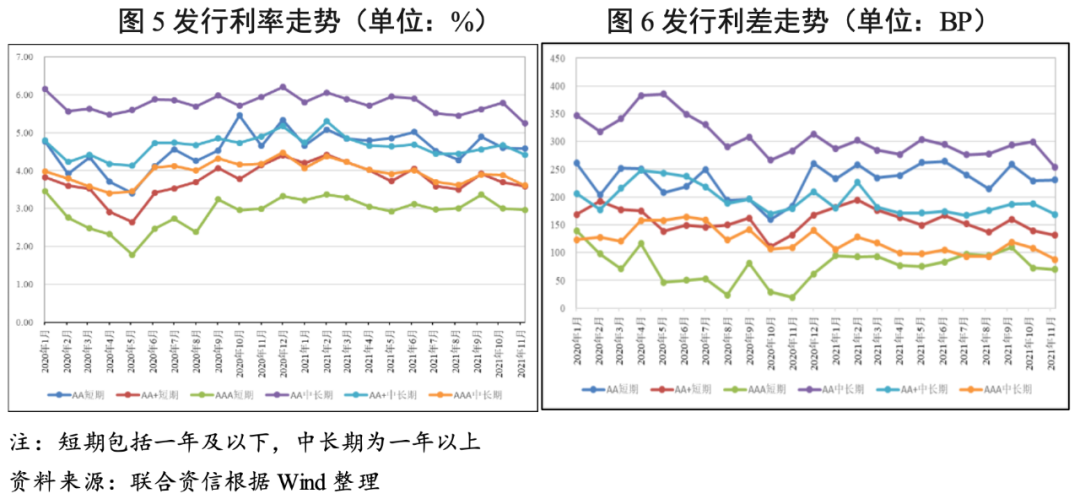 2021年以來,債券市場資金面表現(xiàn)為“先邊際收緊后逐步放松”。具體來看,2021年上半年,隨著國內(nèi)疫情形勢趨于穩(wěn)定,經(jīng)濟(jì)穩(wěn)步復(fù)蘇,債券市場資金面延續(xù)了2020年下半年以來邊際收緊的趨勢;2021年下半年,隨著央行全面降準(zhǔn)以及下調(diào)金融機(jī)構(gòu)存款準(zhǔn)備金率等釋放流動性,市場資金面趨緊態(tài)勢有所回暖。受市場流動性變化的綜合影響,2021年1-11月,不同期限債券的發(fā)行利率和發(fā)行利差走勢呈現(xiàn)分化,短期城投債的發(fā)行利率和發(fā)行利差較2020年均有所上升,中長期城投債的發(fā)行利率變化不大、發(fā)行利差均有所下降。不同地區(qū)城投債發(fā)行利差分化較為明顯。