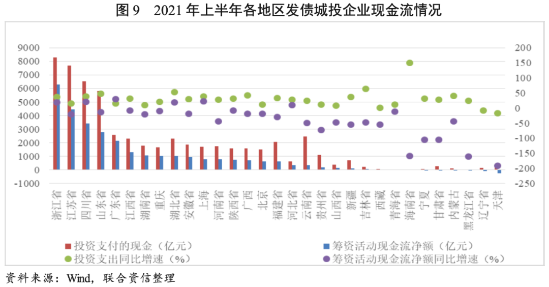 現(xiàn)金流方面,2018以來,城投企業(yè)投資支出增速保持較高水平,表明城投企業(yè)基礎(chǔ)設(shè)施建設(shè)整體投資力度逐年加大。但分區(qū)域來看,2020年,寧夏、青海、西藏、天津、黑龍江、內(nèi)蒙古等地城投企業(yè)投資支出同比有所下降,其他地區(qū)均呈現(xiàn)不同程度增長態(tài)勢;2021年上半年,除天津、遼寧外,其他地區(qū)城投企業(yè)投資支出同比均有所增長?;I資活動方面,2020年以來,天津、內(nèi)蒙古及黑龍江發(fā)債城投企業(yè)籌資活動現(xiàn)金流持續(xù)表現(xiàn)為凈流出,依賴政府回款平衡現(xiàn)金流;2021年上半年,多數(shù)省市城投企業(yè)籌資活動現(xiàn)金流凈額同比下降,天津、內(nèi)蒙古、甘肅、東三省及西南地區(qū)降幅明顯。2021年1-6月,發(fā)債城投企業(yè)投資支付的現(xiàn)金及籌資活動現(xiàn)金流量凈額較上年同期分別增長28.92%和下降9.85%,投資力度加大的同時凈融資規(guī)模收縮,城投企業(yè)資金壓力整體上升。