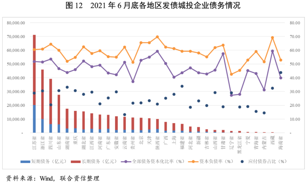 具體來看,截至2021年6月底,江蘇、浙江和四川發(fā)債城投企業(yè)有息債務(wù)規(guī)模位列前三,東三省、西北部省份及海南省發(fā)債城投企業(yè)債務(wù)規(guī)模較小。福建、湖南、西藏、重慶、山東及浙江等地應(yīng)付債券占比均超過30%,對債券融資的依賴度相對較大;隨著到期債券逐步償還,云南、內(nèi)蒙古、青海、黑龍江、甘肅、寧夏等地債券融資占比下降至較低水平。債務(wù)負(fù)擔(dān)方面,陜西、甘肅、天津和四川等發(fā)債城投企業(yè)債務(wù)負(fù)擔(dān)較重,遼寧、黑龍江、內(nèi)蒙古、貴州和海南發(fā)債城投企業(yè)債務(wù)率水平較低,但實際債務(wù)負(fù)擔(dān)需結(jié)合具體城投企業(yè)資產(chǎn)質(zhì)量進(jìn)行甄別分析。