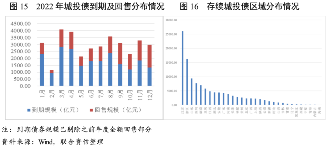 從存續(xù)城投債到期規(guī)模來看,假設(shè)含回售選擇權(quán)的債券全額回售,2022年城投債到期及回售規(guī)模合計35260.99億元,償債壓力明顯大于2021年(約27000億元)。從兌付時間分布來看,2022年3月、4月和8月城投債到期及回售規(guī)模超過3500億元,集中償付壓力較大。區(qū)域方面,需重點關(guān)注天津、甘肅、云南等地城投債兌付壓力,并重點關(guān)注短期償債壓力大及出現(xiàn)逾期、欠息、擔(dān)保代償、非標(biāo)逾期等負(fù)面事件尾部城投企業(yè)的信用風(fēng)險。