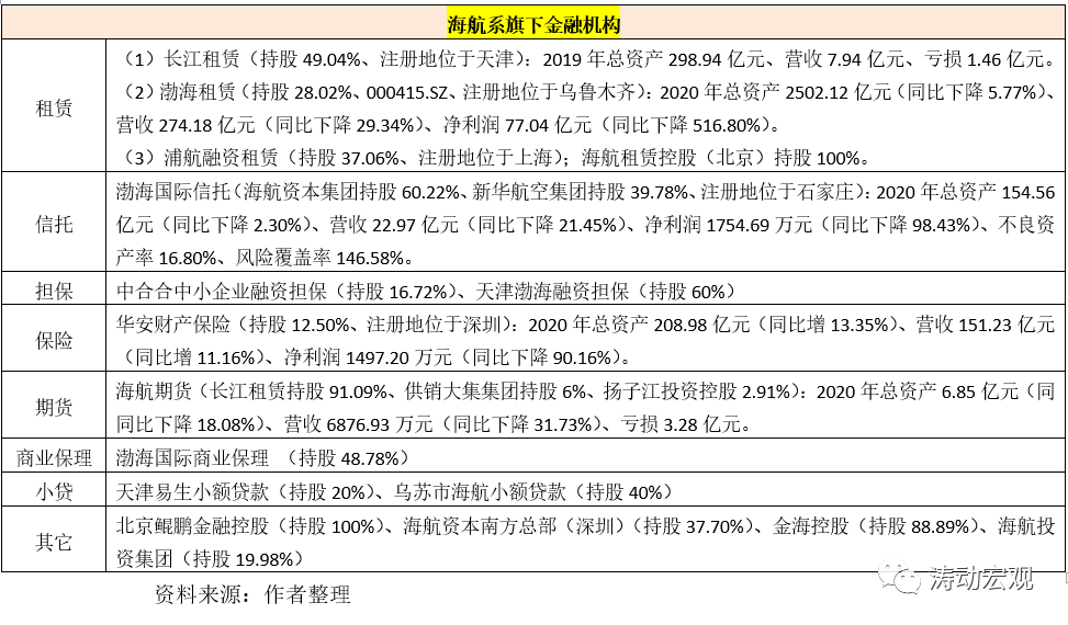 (1)分別有1家信托公司(渤海國際信托)、1家保險公司(華安財產保險)、1家期貨公司(海航期貨)、1家商業保理(渤海國際商業保理)、2家小貸公司、2家融資擔保公司。