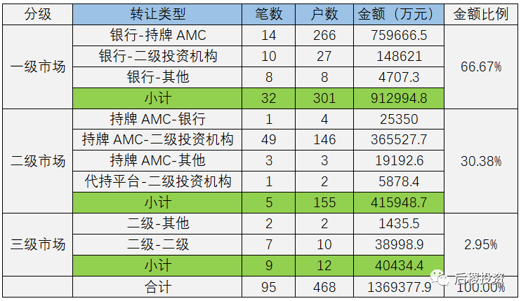 根據(jù)已有數(shù)據(jù)顯示,三級(jí)市場(chǎng)總成交12戶,總成交金額約4億元。成交規(guī)模最大的為二級(jí)投資機(jī)構(gòu)之間的債權(quán)出讓,成交金額在三級(jí)市場(chǎng)中占96.5%。