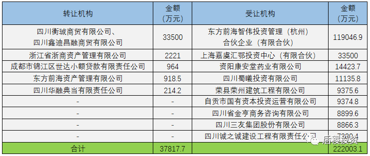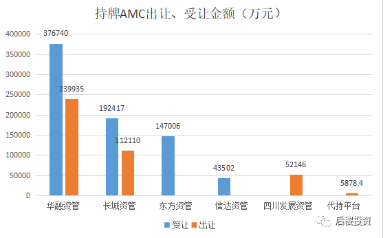 對(duì)比上圖數(shù)據(jù),華融資管與長(zhǎng)城資管均是受讓金額大于出讓金額;未查詢到東方資管、信達(dá)資管出讓記錄,未查詢到四川發(fā)展資管與代持平臺(tái)受讓記錄。