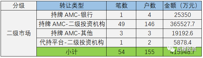 根據(jù)已有數(shù)據(jù)顯示,二級(jí)市場(chǎng)總成交155戶,總成交金額41億余元。成交規(guī)模最大的是持牌AMC-二級(jí)投資機(jī)構(gòu),成交金額在二級(jí)市場(chǎng)中占89%。