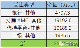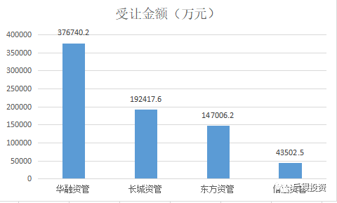 從上圖看,華融資管受讓37.67億元,受讓規(guī)模行業(yè)第一,長(zhǎng)城資管與東方資管受讓金額差距不大,位列二、三名,信達(dá)資管受讓金額最少位列第四。